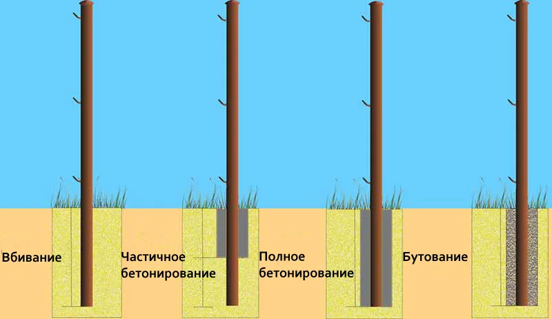 Установка забора из сетки рабицы возможна с бетонированием столбов полным или частичным, c вбиванием столбов в землю, с бутованием.