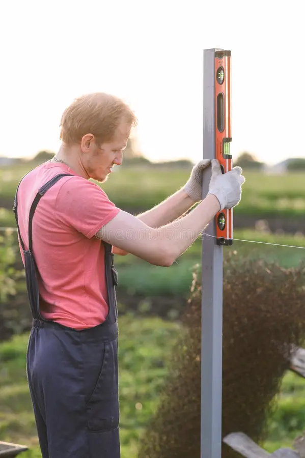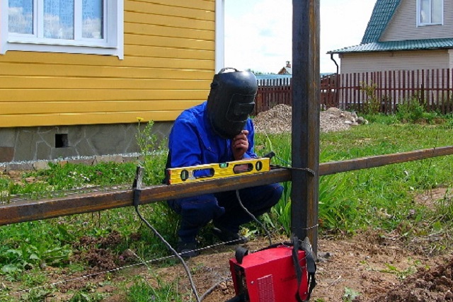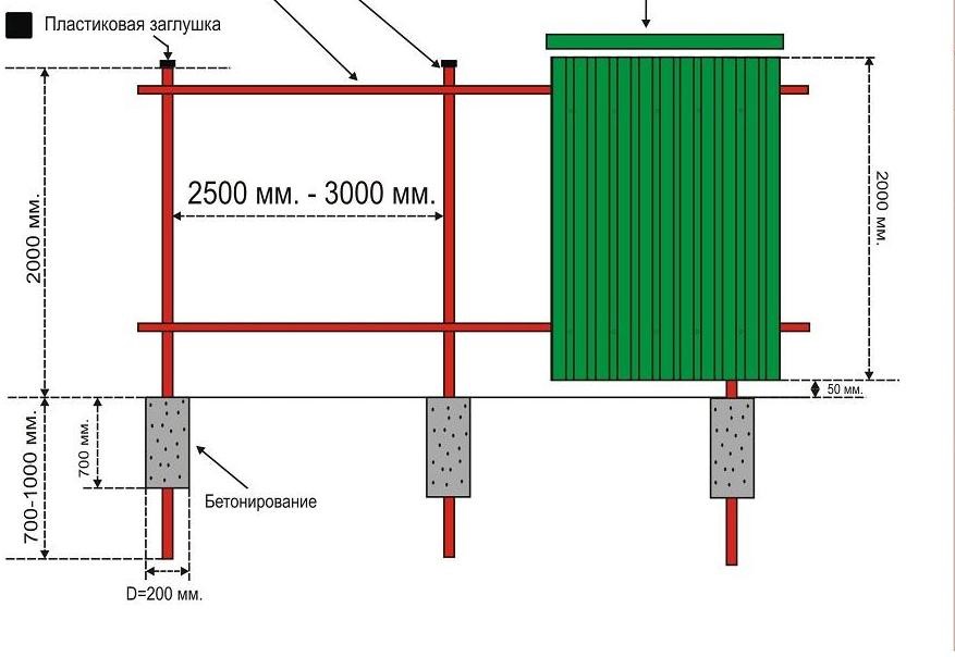 Установка каркаса для забора из профлиста происходит с бетонированием опорных столбов в грунте в вертикальном положение.